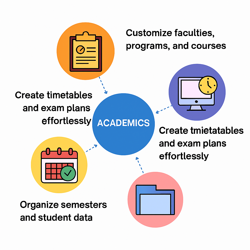 Manage core academic operations, including faculty, departments, programs, and schedules, ensuring streamlined curriculum delivery.